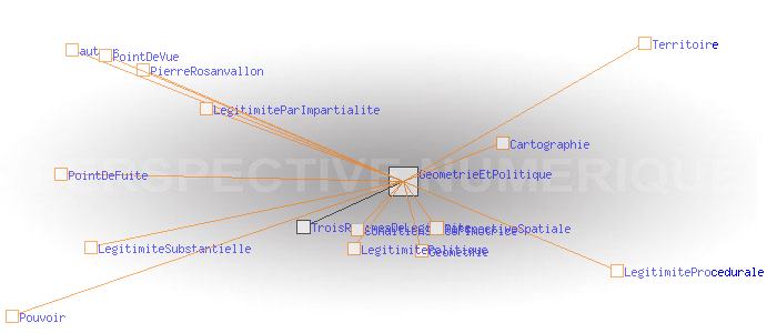 Le régime de légitimité spatial Géométrie et politiqueUn tableau peut être considéré comme répondant aux canons de la perspective spatiale dans la mesure où il donne le sentiment à ses spectateurs qu'ils peuvent idéalement emprunter le point de vue du peintre. En d’autres termes, l'observateur doit pouvoir vérifier d'un seul coup d'oeil que la taille des personnages et les objets est fonction de leur éloignement du point de vue, et qu'un point de fuite homologue de l'oeil de l’auteur organise les fuyantes de manière cohérente. En matière de cartographie, c'est la conformité géométrique de la carte au territoire qui doit pouvoir être vérifiée par l'expérience du terrain. La condition pour que la carte devienne le support des projections et des actions collectives est donc d’ordre sensorimotrice. Pour effectuer la traduction en terme de légitimité politique, il faut remplacer le «peintre» par le «Prince». A savoir que ce dernier doit donner le sentiment à ses sujets que chacun d'eux, se substituant idéalement à lui, effectuerait les mêmes constats, hiérarchiserait les sujets de la même manière, et prendrait les mêmes décisions. Chacun doit aussi pouvoir vérifier qu'il est traité de façon cohérente avec son point de vue et que personne n'échappe à ce traitement, y compris le Prince lui-même. Ces conditions de légitimité quasi géométriques peuvent s’exprimer en termes plus politiques en utilisant la typologie proposée par Pierre Rosanvallon. Selon lui, il existerait trois types de légitimité: