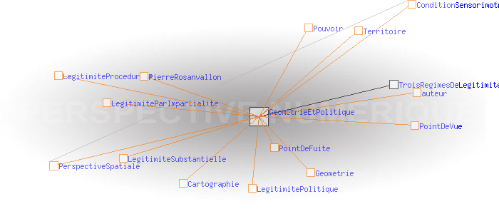 Le régime de légitimité spatial Géométrie et politiqueUn tableau peut être considéré comme répondant aux canons de la perspective spatiale dans la mesure où il donne le sentiment à ses spectateurs qu'ils peuvent idéalement emprunter le point de vue du peintre. En d’autres termes, l'observateur doit pouvoir vérifier d'un seul coup d'oeil que la taille des personnages et les objets est fonction de leur éloignement du point de vue, et qu'un point de fuite homologue de l'oeil de l’auteur organise les fuyantes de manière cohérente. En matière de cartographie, c'est la conformité géométrique de la carte au territoire qui doit pouvoir être vérifiée par l'expérience du terrain. La condition pour que la carte devienne le support des projections et des actions collectives est donc d’ordre sensorimotrice. Pour effectuer la traduction en terme de légitimité politique, il faut remplacer le «peintre» par le «Prince». A savoir que ce dernier doit donner le sentiment à ses sujets que chacun d'eux, se substituant idéalement à lui, effectuerait les mêmes constats, hiérarchiserait les sujets de la même manière, et prendrait les mêmes décisions. Chacun doit aussi pouvoir vérifier qu'il est traité de façon cohérente avec son point de vue et que personne n'échappe à ce traitement, y compris le Prince lui-même. Ces conditions de légitimité quasi géométriques peuvent s’exprimer en termes plus politiques en utilisant la typologie proposée par Pierre Rosanvallon. Selon lui, il existerait trois types de légitimité: