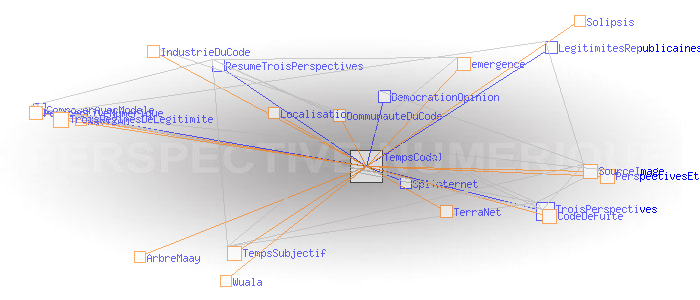 Partie I - Trois perspectivesPerspective numérique et cartographie sémantique #4 ![]() Datapainting / Infoscape / Parcours#1 (identités). Source : Yann Le Guennec Temps codalDès aujourd’hui, des prototypes de moteurs de recherche et d’environnements virtuels distribués (Wuala, TerraNet, NaviZon, Solipsis, @rbre+jMaay, etc.) annoncent des nouveaux modèles concurrents de leurs équivalents centralisés (Google, SecondLife, Facebook, etc). La perspective numérique annonce donc à son tour une perte d'influence des centres de la perspective temporelle aujourd’hui dominants au profit de nouveaux. La nature de ces nouveaux centres est tout à fait paradoxale. En principe, ce sont des codes, c’est à dire des entités qui n’ont pas de rapport avec le temps et l’espace. Or ces codes, de nature arbitraire, sont nécessairement attribués ou déterminés suivant des procédures qui résultent de choix et qui prennent logiquement la forme de programmes et de logiciels. Ces logiciels sont écrits par des humains qui eux, sont situés quelque part. Et ces programmes peuvent aussi changer suivant les choix que font les humains en question. Bref, le " code de fuite" a toujours partie liée avec le temps et l’espace. Le temps subjectif émergeant de l’interaction serait ainsi tributaire d’un temps agissant en amont, que l’on pourrait appeler un " temps codal", c’est à dire qui serait la conséquence des changements de modalités du code (ex: le passage d'une version à une autre d'un programme). Le lieu du code de fuite serait lui, distribué, ou discrétisé, suivant la localisation de tous ceux qui, à un degré ou à un autre, conditionnent ses changements: " industries du code" ou " communautés du code". ![]() Linux timeline: carte des distribution de Linux et de leur mises à jour. Source : Distro Fin de la partie I Parties II - Trois régimes de légitimité Parties II - Perspective et territoire