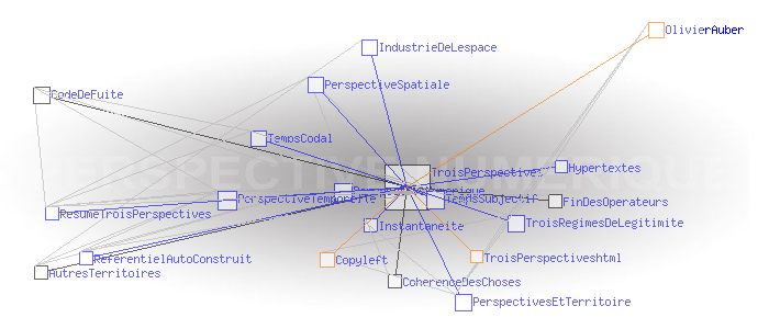 | "L'acte de penser et l'objet de la pensée se confondent" Parménide Full Screen | Play Le contenu de ce wiki est Copyleft     | Partie I - TROIS PERSPECTIVES<Imprimer cette partie>Résumé I.1. Perspective spatiale et cartographie physique I.2. Perspective temporelle et cartographie interactive I.2. Perspective numérique et cartographie sémantique Suite... Parties II - Trois régimes de légitimité Parties III - Perspective et territoire Copyright © 2007 Olivier Auber Copyleft