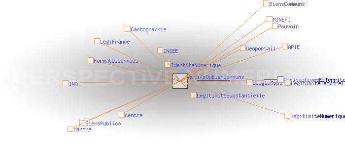 Le territoire et le régime de légitimité temporel Legitimité substantielle: valorisation des actifs ou Biens communs?L’Etat et les collectivités territoriales tentent de réformer leur légitimité substantielle en montrant qu’ils sont les véritables garants de l’intérêt général et des biens publics, matériels et immatériels. A ce titre, l'Etat a entrepris par exemple de restituer aux citoyens les informations dont ils sont la source. Outre le domaine de la cartographie ( Géoportail), c'est aussi le cas en matière d’audio-visuel (INA), de statistique (INSEE), de droit ( LégiFrance), et de finance publique (sites du MINEFI), etc. Cela ne va pas sans difficultés en raison de la confidentialité de certaines données, notamment personnelles, ou du danger supposé que celles-ci soient exploitées ou détournées par des acteurs commerciaux. On retrouve là les questions de concurrence des centres et de l’ identité numérique. Il y a aussi des problèmes techniques, de format de données, etc. Mais au delà se pose un dilemme qui semble être loin de pouvoir être tranché. D’un côté, l’Etat, soucieux de la valorisation de ses actifs pour contribuer à son désendettement, veut faire commerce des biens publics immatériels. C’est ce que prône le rapport Lévy-Jouyet qui a conduit à la création au printemps 2007 de l’Agence du Patrimoine Immatériel de l’État (APIE). De l’autre, il paraît assuré que dès lors que les biens immatériels la collectivité entreraient dans le régime général du marché, ils perdraient immédiatement leur qualité des biens communs. L’Etat et à sa suite les acteurs territoriaux, pourraient à bon droit être considérés comme des entreprises commerciales comme les autres. Ils y perdraient évidemment une part de légitimité substantielle. Ce dilemme ne trouvera probablement pas de résolution dans le cadre du régime de légitimité temporelle qui, en matière d’information, tend à pousser la concurrence des centres jusqu’au paroxysme. Il en serait tout autrement dans un régime de légitimité numérique qui placerait au centre la valeur «lien», et en périphérie, celle du capital. Géoportail: zoom maximum sur la place de la Bastille - présence de la signature incrustée «GEOPORTAIL» GoogleMaps: zoom maximum sur la place de la Bastille (pas de signature incrustée)
