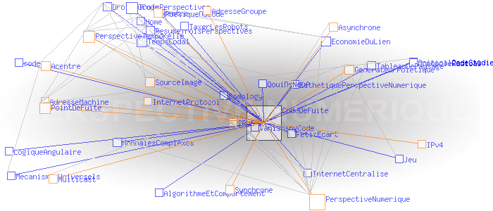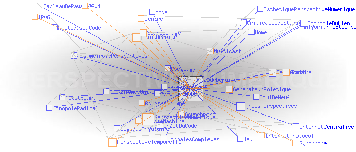 Partie I - Trois perspectivesPerspective numérique et cartographie sémantique #2 Code de fuiteAu coeur de ces innovations, il y a la version 6 de l' Internet Protocol (IPv6) et sa capacité à délivrer une quasi infinité d'adresses, non pas seulement des adresses de machines comme IPv4, mais des adresses de groupes, sous couvert desquelles autant de collectifs plus ou moins étendus peuvent échanger de manière synchrone ou asynchrone sans l'entremise d'aucun centre physique au sens où nous l'avons défini précédemment. C'est le principe de l'IP Multicast. La perspective temporelle actuellement à l'oeuvre (que nous pratiquons comme Monsieur Jourdain...) mutera alors en une " perspective numérique". Pourquoi "numérique"? Parce que le point de fuite de cette troisième perspective, n'est plus un point physique comme dans les deux cas précédents, mais un code - un " code de fuite" -, qui dans le cas du Multicast, est le numéro IP du groupe sous couvert duquel celui-ci peut échanger. Dit autrement, ce code de fuite est simplement le seul point commun entre tous les membres d'un groupe livré à une forme ou une autre d'interaction collective. ![]() Générateur Poïétique: résultat de la première expérience d’ interaction collective synchrone acentrée sur le Multicast Backbone mondial, le 21 novembre 1996 (montage de plans successifs). Source: poietic-generator.net