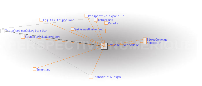 Le régime de légitimité temporel Composer avec le modèleDans la pratique, les choses ne sont évidemment pas si simples: L’ immédiateté pose un problème aux institutions fondées sur le régime de légitimité spatial dont les boucles de rétroaction et de validation sont lentes et fortement ritualisées (le suffrage universel soumis au temps codal). Les biens communs posent un problème à certaines industries du temps, les entreprises de communication, dont le modèle capitaliste vise plutôt à organiser la rareté et à obtenir des positions de monopole. Dans ces deux sphères, les organisations ont donc mis en place des modes de fonctionnement qui composent autant que possible leur réalité propre avec les canons de la perspective temporelle: c’est que l’on peut appeler l’ « économie de l’attention».