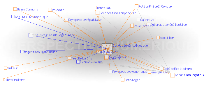 Le régime de légitimité numérique Condition ontologiquePour tenter de d’imaginer le régime de légitimité de la perspective numérique, il faut pousser les logiques des réseaux acentrés dans leurs retranchements afin de construire la cité idéale qui leur ressemble. Comme dans le cas des réseaux centrés, un dispositif acentré peut être considéré comme légitime dans la mesure où il donne le sentiment à chacun des acteurs qu'il pourrait idéalement l’administrer lui-même, voire en modifier éventuellement les règles de fonctionnement. L'utilisateur doit pouvoir vérifier par l'action directe sur le dispositif que son action est prise en compte et traitée immédiatement suivant des règles explicites, comme c’est aussi le cas des actions de tous les autres utilisateurs, y compris celles des auteurs des codes et des interfaces qui lui permettant de fonctionner. Comme dans le cas de la perspective temporelle, chacun doit pouvoir observer directement le résultat de son action personnelle au sein du collectif ( validation cognitive). Mais il faut de plus que le code fasse «lien», c’est à dire qu’il soit reconnu comme signe d’appartenance par le groupe qui l’utilise. Pour cela, d'une part le code doit laisser à chacun son libre arbitre pour savoir s'il le rejoint ou non, puis s'il se retire ou non. D'autre part, tout comme un lieu public n’impose pas les termes des conversations qui s’y déroulent, il ne doit pas présumer, ni de la nature ni de l’issue des interactions qui doivent donc rester le propre du groupe. En dernier ressort, cette reconnaissance du lien passe par une autre, celle du caractère "authentique" des échanges. Il s’agit de reconnaître l’autre et de démasquer tout ce qui n'est pas être lui. Une expérience ontologique en somme, dans laquelle il s’agit d’attendre que " ça arrive" (ou pas), de constater (ou pas) qu’une chose sublime (ou pas) et non préméditée (ou pas) émerge (ou pas) instant après instant à l’intérieur de laquelle chacun reconnaît sa présence (ou pas). En termes scientifiques, cela s'appelle un test de Turing, à l’envers, et à l’échelle collective. Enfin, plus encore que dans le cas de perspective spatiale, le résultat des échanges via un réseau acentré se doit d’être le bien commun des protagonistes. Une fois remplies ces conditions, de l’ interaction collective peut naître le référentiel qui permet à nouveau l’ interaction.