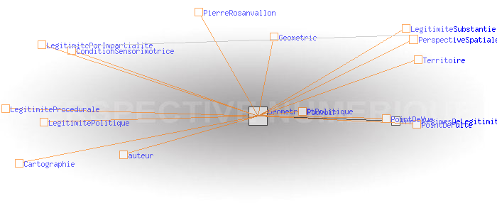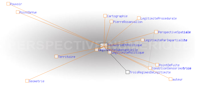 Le régime de légitimité spatial Géométrie et politiqueUn tableau peut être considéré comme répondant aux canons de la perspective spatiale dans la mesure où il donne le sentiment à ses spectateurs qu'ils peuvent idéalement emprunter le point de vue du peintre. En d’autres termes, l'observateur doit pouvoir vérifier d'un seul coup d'oeil que la taille des personnages et les objets est fonction de leur éloignement du point de vue, et qu'un point de fuite homologue de l'oeil de l’auteur organise les fuyantes de manière cohérente. En matière de cartographie, c'est la conformité géométrique de la carte au territoire qui doit pouvoir être vérifiée par l'expérience du terrain. La condition pour que la carte devienne le support des projections et des actions collectives est donc d’ordre sensorimotrice. Pour effectuer la traduction en terme de légitimité politique, il faut remplacer le «peintre» par le «Prince». A savoir que ce dernier doit donner le sentiment à ses sujets que chacun d'eux, se substituant idéalement à lui, effectuerait les mêmes constats, hiérarchiserait les sujets de la même manière, et prendrait les mêmes décisions. Chacun doit aussi pouvoir vérifier qu'il est traité de façon cohérente avec son point de vue et que personne n'échappe à ce traitement, y compris le Prince lui-même. Ces conditions de légitimité quasi géométriques peuvent s’exprimer en termes plus politiques en utilisant la typologie proposée par Pierre Rosanvallon. Selon lui, il existerait trois types de légitimité: