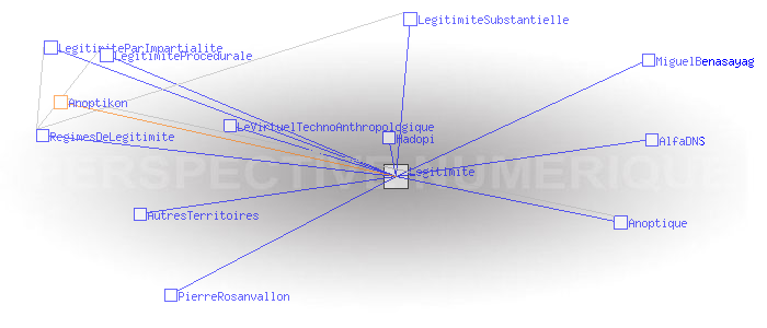 A) Tout agent A a-t-il le droit réel d’accéder au réseau s’il en fait la demande? A peut-il quitter le réseau librement ? AB) Tout agent B (présent ou futur, y compris les agents qui conçoivent, gèrent et développent le réseau) est-il traité comme A ? ABC) Si trois agents A, B et C (trois étant le début d’une multitude) appartiennent à un réseau qui répond aux deux premiers critères, constituent ils des pairs? Autrement dit, sont-ils en mesure de se reconnaître, de se faire confiance, de se respecter les uns les autres, de construire des représentations communes et du sens commun ? Voir Pages ayant un lien vers la page courante : AlfaDNS Anoptique AutresTerritoires Hadopi LegitimiteParImpartialite LegitimiteProcedurale LegitimiteSubstantielle LeVirtuelTechnoAnthropologique MiguelBenasayag PierreRosanvallon RegimesDeLegitimite