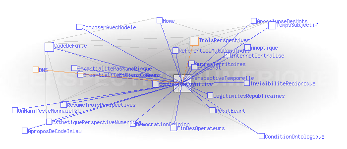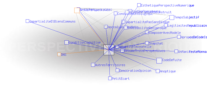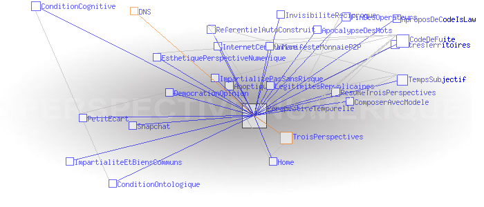 perspective temporelleLa perspective temporelle est née pendant la Révolution française avec l'invention du télégraphe. Elle domine aujourd'hui. Ses points de fuite sont les moteurs de recherche, les sites web et le système de DNS que nous connaissons. Voir "Trois perspectives" Pages ayant un lien vers la page courante : Anoptique ApocalypseDesMots AproposDeCodeIsLaw AutresTerritoires CodeDeFuite ComposerAvecModele ConditionCognitive ConditionOntologique DemocrationOpinion EsthetiquePerspectiveNumerique FinDesOperateurs ImpartialiteEtBiensCommuns ImpartialitePasSansRisque InternetCentralise InvisibiliteReciproque LegitimitesRepublicaines PetitEcart ReferentielAutoConstruit ResumeTroisPerspectives Snapchat TempsSubjectif UnManifesteMonnaieP2P