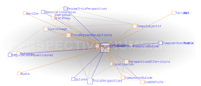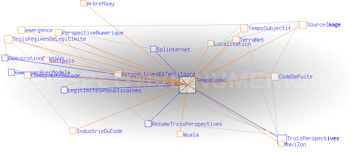 Partie I - Trois perspectivesPerspective numérique et cartographie sémantique #4 ![]() Datapainting / Infoscape / Parcours#1 (identités). Source : Yann Le Guennec Temps codalDès aujourd’hui, des prototypes de moteurs de recherche et d’environnements virtuels distribués (Wuala, TerraNet, NaviZon, Solipsis, @rbre+jMaay, etc.) annoncent des nouveaux modèles concurrents de leurs équivalents centralisés (Google, SecondLife, Facebook, etc). La perspective numérique annonce donc à son tour une perte d'influence des centres de la perspective temporelle aujourd’hui dominants au profit de nouveaux. La nature de ces nouveaux centres est tout à fait paradoxale. En principe, ce sont des codes, c’est à dire des entités qui n’ont pas de rapport avec le temps et l’espace. Or ces codes, de nature arbitraire, sont nécessairement attribués ou déterminés suivant des procédures qui résultent de choix et qui prennent logiquement la forme de programmes et de logiciels. Ces logiciels sont écrits par des humains qui eux, sont situés quelque part. Et ces programmes peuvent aussi changer suivant les choix que font les humains en question. Bref, le " code de fuite" a toujours partie liée avec le temps et l’espace. Le temps subjectif émergeant de l’interaction serait ainsi tributaire d’un temps agissant en amont, que l’on pourrait appeler un " temps codal", c’est à dire qui serait la conséquence des changements de modalités du code (ex: le passage d'une version à une autre d'un programme). Le lieu du code de fuite serait lui, distribué, ou discrétisé, suivant la localisation de tous ceux qui, à un degré ou à un autre, conditionnent ses changements: " industries du code" ou " communautés du code". ![]() Linux timeline: carte des distribution de Linux et de leur mises à jour. Source : Distro Fin de la partie I Parties II - Trois régimes de légitimité Parties II - Perspective et territoire