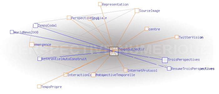 Partie I - Trois perspectivesPerspective temporelle et cartographie interactive #2 Temps subjectifL' Internet Protocol dans sa version 4 (IPv4), définit en effet une collection de centres dont aucun n'est prééminent, du moins en théorie. Pour communiquer à plusieurs, a fortiori instantanément, un groupe doit accepter de passer par l'un de ces centres, qui de ce fait, n'est plus équivalent aux autres. Il émerge ainsi une hiérarchie des centres. Petit ou grand, chacun d’entre eux est le point de fuite de la construction de la représentation du groupe qui l'utilise suivant le schéma d’une perspective temporelle. Pourquoi cet adjectif "temporelle" cette fois? Parce que dans le cadre d’une interaction instantanée, comme c’est de plus en plus le cas, c'est au niveau de l'émetteur-récepteur qu' émerge au fur et à mesure qu'il reçoit l'information de tous, la représentation et le temps propres du groupe, à la résolution près de son horloge interne. Le temps dont il s’agit ici n’est plus le temps linéaire corrélé à la distance suivant le schéma de la perspective spatiale ; il s'agit d'un temps subjectif construit au gré de l' interaction du groupe relativement au centre qu’il choisit, ou qui lui est imposé, pour s’actualiser. ![]() TwitterVision 3D Source: twittervision.com