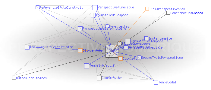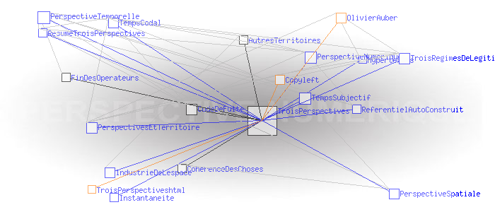 Partie I - TROIS PERSPECTIVES<Imprimer cette partie>Résumé I.1. Perspective spatiale et cartographie physique I.2. Perspective temporelle et cartographie interactive I.2. Perspective numérique et cartographie sémantique Suite... Parties II - Trois régimes de légitimité Parties III - Perspective et territoire Copyright © 2007 Olivier Auber Copyleft