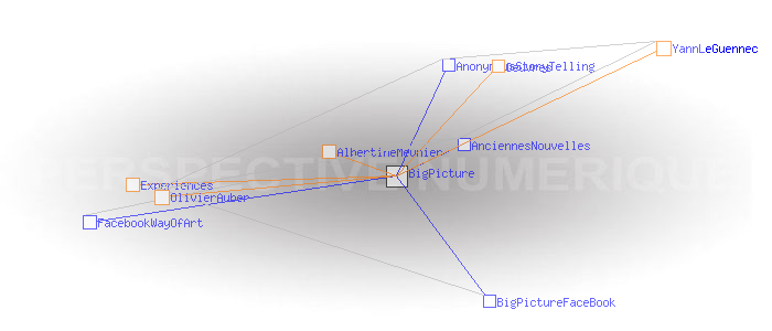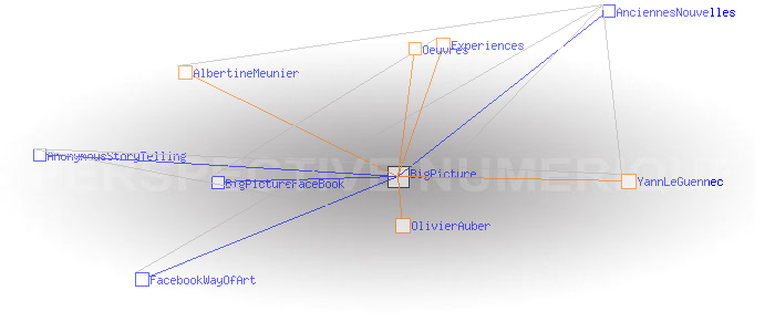 Facebook Art par AlbertineMeunier, YannLeGuennec et OlivierAuber [ENGL.] A visual widget to follow your Facebook friends' Status Updates A living Big Picture of all Friends' Updates. An art experiment: "catching the movie of the social media explosion?" [FR.] Un widget pour suivre visuellement les mises à jour des amis sur Facebook Une BIG PICTURE vivante de toutes les mises à jour. Une expérience artistique: "filmer l'explosion des médias sociaux?" (c) Albertine Meunier, Yann le Guennec, Olivier Auber Copyleft (Free Art Licence) # http://www.albertinemeunier.net # http://anoptique.com # http://artlibre.org # voir la Big Picture en temps réel # lire la Big Picture # le status sur facebook, c'est quoi ? # pour participer : ajouter votre module Facebook Friends' Status Updates in the Big Picture ? # pour participer : mettre de la couleur sur vos amis afin de donner de la couleur avec votre module ? # comment installer le widget Big Picture dans iGoogle, Netvibes ? # comment voir le module Big Picture d'une seule personne ? # comment installer le widget Big Picture d'une seule personne dans iGoogle, Netvibes ? La Big Picture, capture of 1 month Facebook activity A living Big Picture of Facebook friends' Updates recorded during one month Page Facebook Page Albertine (Comment plonger dans la Big Picture?) Oeuvres OlivierAuber YannLeGuennec AlbertineMeunier Expérience