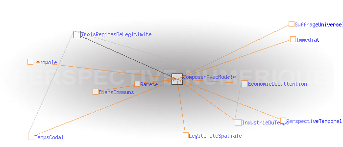 Le régime de légitimité temporel Composer avec le modèleDans la pratique, les choses ne sont évidemment pas si simples: L’ immédiateté pose un problème aux institutions fondées sur le régime de légitimité spatial dont les boucles de rétroaction et de validation sont lentes et fortement ritualisées (le suffrage universel soumis au temps codal). Les biens communs posent un problème à certaines industries du temps, les entreprises de communication, dont le modèle capitaliste vise plutôt à organiser la rareté et à obtenir des positions de monopole. Dans ces deux sphères, les organisations ont donc mis en place des modes de fonctionnement qui composent autant que possible leur réalité propre avec les canons de la perspective temporelle: c’est que l’on peut appeler l’ « économie de l’attention».