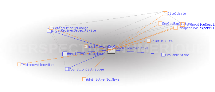 Le régime de légitimité temporel Condition cognitiveLa cité idéale de la perspective temporelle peut être imaginée sur le même modèle que celle de la perspective spatiale. Un système centralisé de traitement de l'information peut être considéré comme légitime dans la mesure où il donne le sentiment à chacun des acteurs qu'il pourrait idéalement l’ administrer lui-même, voire en modifier éventuellement les règles de fonctionnement. L'utilisateur doit pouvoir vérifier par l'action directe sur le dispositif que son action est prise en compte et traitée immédiatement suivant des règles explicites, comme c’est aussi le cas des actions de tous les autres utilisateurs, y compris celles de l'administrateur du système. Dans la cité idéale de la perspective temporelle, la validation de l’efficience du point de fuite à gérer son territoire de signes se fait très simplement: chacun voit directement le résultat de son action personnelle au sein du collectif et en conclut – ou pas - que «ça marche». Il s'agit donc d'une validation cognitive.
