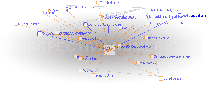 Le régime de légitimité numérique Condition ontologiquePour tenter de d’imaginer le régime de légitimité de la perspective numérique, il faut pousser les logiques des réseaux acentrés dans leurs retranchements afin de construire la cité idéale qui leur ressemble. Comme dans le cas des réseaux centrés, un dispositif acentré peut être considéré comme légitime dans la mesure où il donne le sentiment à chacun des acteurs qu'il pourrait idéalement l’administrer lui-même, voire en modifier éventuellement les règles de fonctionnement. L'utilisateur doit pouvoir vérifier par l'action directe sur le dispositif que son action est prise en compte et traitée immédiatement suivant des règles explicites, comme c’est aussi le cas des actions de tous les autres utilisateurs, y compris celles des auteurs des codes et des interfaces qui lui permettant de fonctionner. Comme dans le cas de la perspective temporelle, chacun doit pouvoir observer directement le résultat de son action personnelle au sein du collectif ( validation cognitive). Mais il faut de plus que le code fasse «lien», c’est à dire qu’il soit reconnu comme signe d’appartenance par le groupe qui l’utilise. Pour cela, d'une part le code doit laisser à chacun son libre arbitre pour savoir s'il le rejoint ou non, puis s'il se retire ou non. D'autre part, tout comme un lieu public n’impose pas les termes des conversations qui s’y déroulent, il ne doit pas présumer, ni de la nature ni de l’issue des interactions qui doivent donc rester le propre du groupe. En dernier ressort, cette reconnaissance du lien passe par une autre, celle du caractère "authentique" des échanges. Il s’agit de reconnaître l’autre et de démasquer tout ce qui n'est pas être lui. Une expérience ontologique en somme, dans laquelle il s’agit d’attendre que " ça arrive" (ou pas), de constater (ou pas) qu’une chose sublime (ou pas) et non préméditée (ou pas) émerge (ou pas) instant après instant à l’intérieur de laquelle chacun reconnaît sa présence (ou pas). En termes scientifiques, cela s'appelle un test de Turing, à l’envers, et à l’échelle collective. Enfin, plus encore que dans le cas de perspective spatiale, le résultat des échanges via un réseau acentré se doit d’être le bien commun des protagonistes. Une fois remplies ces conditions, de l’ interaction collective peut naître le référentiel qui permet à nouveau l’ interaction.