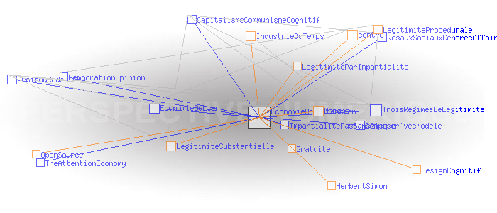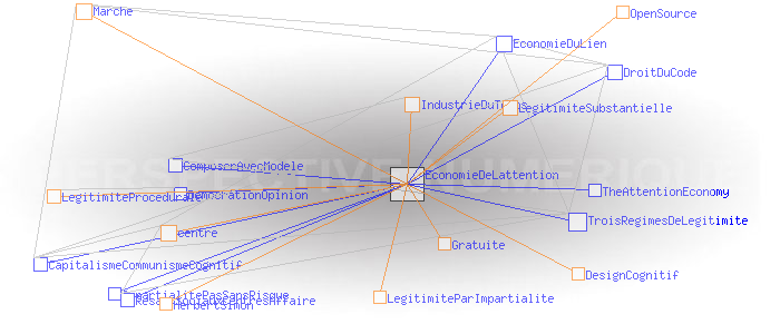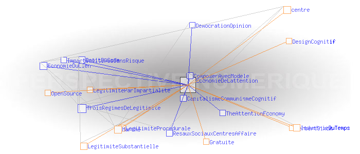 Le régime de légitimité temporel Economie de l’attentionDans la sphère commerciale, ce qui confère à un centre sa capacité d’agréger et de redistribuer l’information, est simplement l’«attention» portée par les utilisateurs au dispositif, c’est à dire le temps qu’ils passent et les gestes qu’ils produisent en interaction avec lui ( Herbert Simon, 1971). Les industries du temps transforment cette matière première en revenus, par exemple, par l’entremise de la publicité. La légitimité de centres de cette économie est donc essentiellement de type procédurale: plus il y a d’attention, plus il y a de ressources (publicitaires entre autres), plus il y a de moyens pour absorber et redistribuer des données et donc pour mobiliser l’attention, ainsi de suite… Les centres de l’ économie de l’attention développent aussi une forme de légitimité par impartialité reposant souvent sur la gratuité des services - qui de fait, traite chacun de manière équivalente -, et sur l’ergonomie et de design cognitif qui assure une certaine lisibilité des processus. La légitimité substantielle provient souvent d’une sorte de mythe fondateur lié à l’innovation, matérialisée par des brevets, des copyrights et des logiciels, bref des codes qui acquièrent d’autant plus de légitimité qu’ils sont livrés finalement à tous en OpenSource. En dernier ressort, la légitimité substantielle provient surtout de la validation de ces innovations par le « marché»; substitut mondain de l’ordre divin.