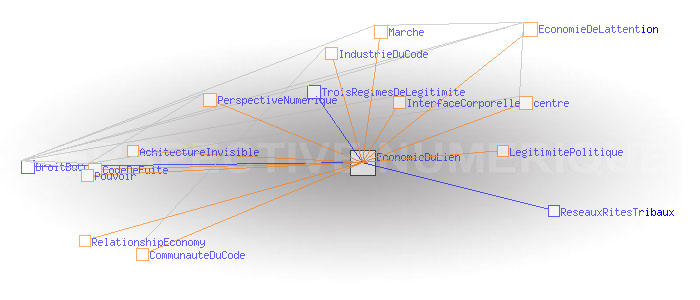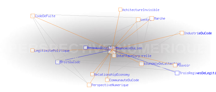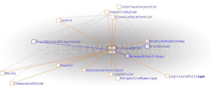 Le régime de légitimité numérique Economie du lienLa traduction de la perspective numérique en terme de légitimité politique est très complexe à imaginer. Cependant, nous pouvons faire l’hypothèse que l’économie précédente fondée sur l’ attention cèderait le pas à une " économie du lien", entre les individus, entre groupes . La boucle du marché, si on peut encore l'appeler ainsi, pourrait être décrite ainsi: le lien aurait besoin d’interface, l’interface aurait besoin de programmes susceptibles de créer du lien, et ainsi de suite. La production et la consommation de biens matériels ne seraient qu’une conséquence indirecte du fonctionnement de cette boucle. Dans les perspectives spatiale et temporelle, le pouvoir était concentré aux points de fuite. Dans la perspective numérique, bien que le code de fuite soit un centre immatériel, arbitraire, et insaisissable, le pouvoir se concentrerait aussi sur lui. Mais alors où serait-il? Et bien simplement sur le cadre ouvrant sur la perspective: l' architecture invisible des interfaces et des programmes qui recèlent les codes permettant aux groupes de commuter. La primauté donnée par la précédente perspective aux centres agrégateurs disparaît donc au profit d’autres acteurs que l'on a appelé les " industries du code" ou les " communautés du code" suivant la manière dont ils se structurent. RelationshipEconomy