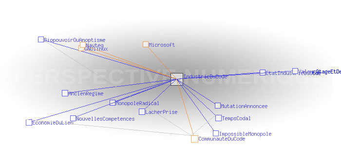 Les réseaux des développeurs de GNU/Linux et de beaucoup d'autres logiciels libres apparatiennent plutôt à la catégorie des communautés du code. Pages ayant un lien vers la page courante : AncienRegime BiopouvoirOuAnoptisme EconomieDuLien EtatIndustrieDuCode ImpossibleMonopole IndustrieDuCode LacherPrise MonopoleRadical MutationAnnoncee NouvellesCompetences TempsCodal ValeurOtageEtDependance