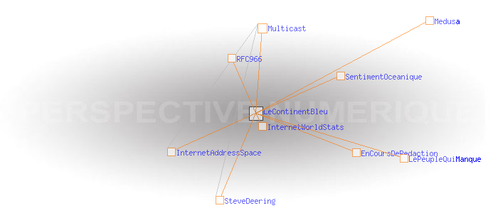 Le continent bleuEnCoursDeRedaction Il est de plus en plus évident que l'Internet mondial doit maintenant procéder à une rénovation majeure pour arriver à suivre l'explosion des besoins et des usages de ses utilisateurs dont le nombre a maintenant dépassé le milliard. Les principes techniques de l'Internet tels que nous le connaissons datent en effet de 1983. 'est l"Internet Protocol" IP version 4 (IPv4). Le passage à la nouvelle technologie "IPv6" est préparée de longue date par l'IPv6 Task Force ![]() Gauche=Carte globale de l'Internet Address Space | Centre zoom#1 | Droite = zoom#2 | Rouge=ne répond pas | Vert=actif | Bleu=privé ou non affecté ![]() IPv4AddressReport http://www.potaroo.net/tools/ipv4/index.html Notes: IPv6 Task Force http://www.g6.asso.fr/tff/index.php/Main_Page IPv4AddressReport http://www.potaroo.net/tools/ipv4/index.html InternetAddressSpace http://www.isi.edu/ant/adress/index.html Medusa Multicast RFC 966 - Host groups: A multicast extension to the Internet Protocol S. E. Deering, D. R. Cheriton, Stanford University, December 1985 http://www.faqs.org/rfcs/rfc966.html SentimentOceanique? LePeupleQuiManque?