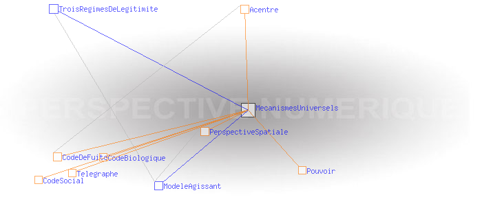 Mécanismes universelsIl faut observer que les mécanismes psychologiques et sociaux sous jacents aux perspectives spatiales, temporelle et numérique ont probablement toujours existé et constituent peut-être même des traits récurrents du phénomène anthropique. Bien avant bien l'invention de la perspective spatiale, le temps et l'espace semblaient avoir parties liées. Bien avant l’invention du télégraphe, les informations issues des occupants d’un territoire convergeaient vers des lieux sacrés, des palais ou des sièges gouvernementaux qui les traitaient et les redistribuaient dans une certaine mesure. Et les hommes n’ont pas attendu l’invention des réseaux acentrés et de leurs codes de fuites, pour s’assembler en groupes sous couvert de codes sociaux, tels que la langue, la religion, le sexe, l’âge, le niveau d’éducation, les options politiques, le type de production ou de consommation, etc. De même, certains codes biologiques prédisposant à des maladies ou certaines substances chimiques jouent des rôles similaires dans les assemblages humains. Ces mécanismes ont induit certains pouvoirs et normé leurs régimes de légitimité respectifs bien avant l'irruption des trois perspectives que nous décrivons.