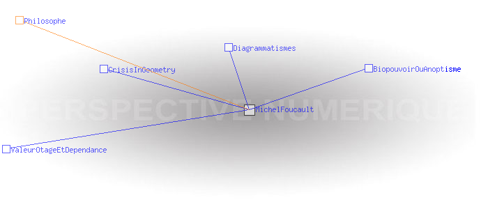 Michel FoucaultPaul Michel Foucault, né le 15 octobre 1926 à Poitiers et mort le 26 juin 1984 à Paris, est un philosophe français. Il fut, entre 1970 et 1984 titulaire d'une chaire au Collège de France à laquelle il donna le titre d'Histoire des Systèmes de Pensée. http://fr.wikipedia.org/wiki/Michel_Foucault Philosophe Pages ayant un lien vers la page courante : BiopouvoirOuAnoptisme CrisisInGeometry Diagrammatismes ValeurOtageEtDependance