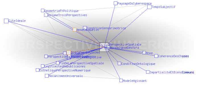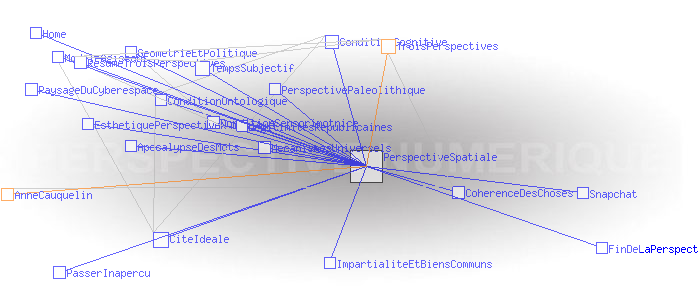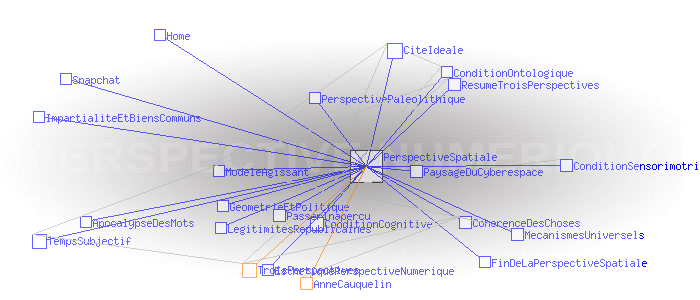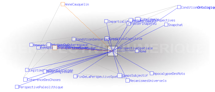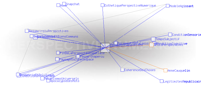 Perspective spatialeVoici quelques 600 ans [..] avec l’invention de la perspective, le tableau de paysage devient la norme de la perception de ce qui nous entoure. [...] Elle ne semble plus convenir à la perception d’un monde que les nouvelles technologies de la communication ont bouleversé. Anne Cauquelin Voir "Trois perspectives" Pages ayant un lien vers la page courante : ApocalypseDesMots CiteIdeale CoherenceDesChoses ConditionCognitive ConditionOntologique ConditionSensorimotrice EsthetiquePerspectiveNumerique FinDeLaPerspectiveSpatiale GeometrieEtPolitique ImpartialiteEtBiensCommuns LegitimitesRepublicaines MecanismesUniversels ModeleAgissant PasserInapercu PaysageDuCyberespace PerspectivePaleolithique ResumeTroisPerspectives Snapchat TempsSubjectif