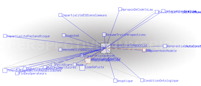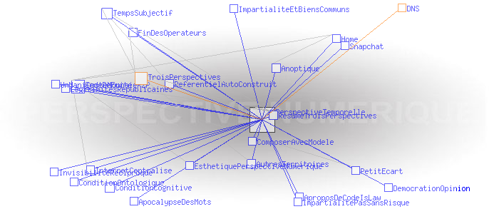 perspective temporelleLa perspective temporelle est née pendant la Révolution française avec l'invention du télégraphe. Elle domine aujourd'hui. Ses points de fuite sont les moteurs de recherche, les sites web et le système de DNS que nous connaissons. Voir "Trois perspectives" Pages ayant un lien vers la page courante : Anoptique ApocalypseDesMots AproposDeCodeIsLaw AutresTerritoires CodeDeFuite ComposerAvecModele ConditionCognitive ConditionOntologique DemocrationOpinion EsthetiquePerspectiveNumerique FinDesOperateurs ImpartialiteEtBiensCommuns ImpartialitePasSansRisque InternetCentralise InvisibiliteReciproque LegitimitesRepublicaines PetitEcart ReferentielAutoConstruit ResumeTroisPerspectives Snapchat TempsSubjectif UnManifesteMonnaieP2P