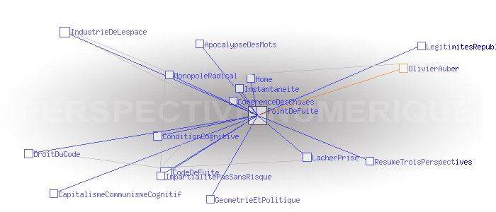 Point de fuiteOlivierAuber. (Texte publié pour la première fois en 1997 sur http://enst.fr/~auber cf. Wayback machine) Esquisse d'une filiation des perspectives spatiale, temporelle, numérique "L'art reste fidèle aux hommes uniquement par son inhumanité à leur égard". Theodor Adorno. Les "mots" semblent impuissants pour appréhender la réalité sublime et menaçante de la vitesse des réseaux, ou alors ils la saisissent par défaut, en évoquant la perte de sens, la désorientation, le chaos, voire "l'accident des accidents"(1). Une parole originaire nous regardant depuis l'envers de la mort, aurait-elle comme projet l'aveuglement définitif ? Ou bien, de nouvelles formes d'écriture sont-elles capables de se frayer un passage pour exprimer à nouveau, la plénitude, l'unité et l'immédiateté du sens? Le projet du "Générateur Poïétique"(2) dont il est question ici, interroge et prolonge l'un de ces "mots" cataclysmiques apparu il y a quelques années sous la plume de Paul Virilio : la "perspective temporelle"(3). L'expérience proposée vise à développer une pratique tout autant qu'une critique de la vitesse.