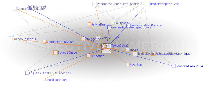 Partie I - Trois perspectivesPerspective numérique et cartographie sémantique #4 ![]() Datapainting / Infoscape / Parcours#1 (identités). Source : Yann Le Guennec Temps codalDès aujourd’hui, des prototypes de moteurs de recherche et d’environnements virtuels distribués (Wuala, TerraNet, NaviZon, Solipsis, @rbre+jMaay, etc.) annoncent des nouveaux modèles concurrents de leurs équivalents centralisés (Google, SecondLife, Facebook, etc). La perspective numérique annonce donc à son tour une perte d'influence des centres de la perspective temporelle aujourd’hui dominants au profit de nouveaux. La nature de ces nouveaux centres est tout à fait paradoxale. En principe, ce sont des codes, c’est à dire des entités qui n’ont pas de rapport avec le temps et l’espace. Or ces codes, de nature arbitraire, sont nécessairement attribués ou déterminés suivant des procédures qui résultent de choix et qui prennent logiquement la forme de programmes et de logiciels. Ces logiciels sont écrits par des humains qui eux, sont situés quelque part. Et ces programmes peuvent aussi changer suivant les choix que font les humains en question. Bref, le " code de fuite" a toujours partie liée avec le temps et l’espace. Le temps subjectif émergeant de l’interaction serait ainsi tributaire d’un temps agissant en amont, que l’on pourrait appeler un " temps codal", c’est à dire qui serait la conséquence des changements de modalités du code (ex: le passage d'une version à une autre d'un programme). Le lieu du code de fuite serait lui, distribué, ou discrétisé, suivant la localisation de tous ceux qui, à un degré ou à un autre, conditionnent ses changements: " industries du code" ou " communautés du code". ![]() Linux timeline: carte des distribution de Linux et de leur mises à jour. Source : Distro Fin de la partie I Parties II - Trois régimes de légitimité Parties II - Perspective et territoire