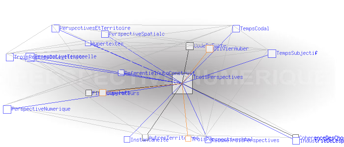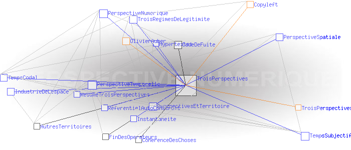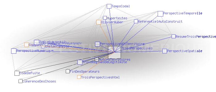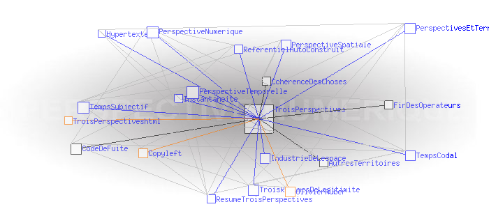 Partie I - TROIS PERSPECTIVES<Imprimer cette partie>Résumé I.1. Perspective spatiale et cartographie physique I.2. Perspective temporelle et cartographie interactive I.2. Perspective numérique et cartographie sémantique Suite... Parties II - Trois régimes de légitimité Parties III - Perspective et territoire Copyright © 2007 Olivier Auber Copyleft