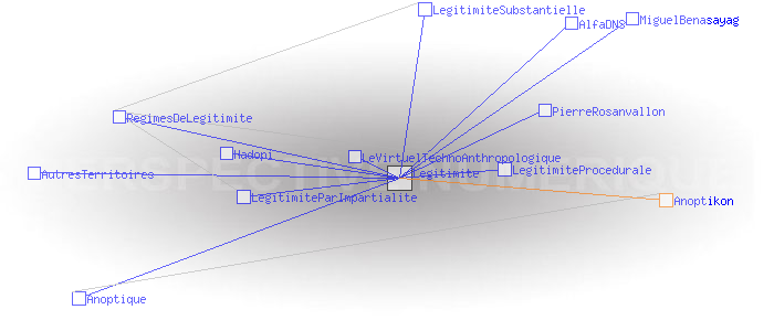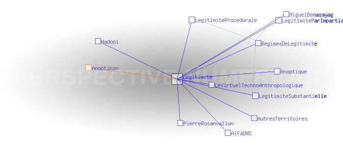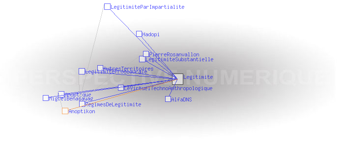 A) Tout agent A a-t-il le droit réel d’accéder au réseau s’il en fait la demande? A peut-il quitter le réseau librement ? AB) Tout agent B (présent ou futur, y compris les agents qui conçoivent, gèrent et développent le réseau) est-il traité comme A ? ABC) Si trois agents A, B et C (trois étant le début d’une multitude) appartiennent à un réseau qui répond aux deux premiers critères, constituent ils des pairs? Autrement dit, sont-ils en mesure de se reconnaître, de se faire confiance, de se respecter les uns les autres, de construire des représentations communes et du sens commun ? Voir Pages ayant un lien vers la page courante : AlfaDNS Anoptique AutresTerritoires Hadopi LegitimiteParImpartialite LegitimiteProcedurale LegitimiteSubstantielle LeVirtuelTechnoAnthropologique MiguelBenasayag PierreRosanvallon RegimesDeLegitimite