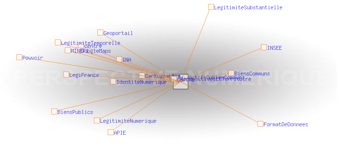 Partie III - Perspectives et territoire Le territoire et le régime de légitimité temporel Legitimité substantielle: valorisation des actifs ou Biens communs?L’Etat et les collectivités territoriales tentent de réformer leur légitimité substantielle en montrant qu’ils sont les véritables garants de l’intérêt général et des biens publics, matériels et immatériels. A ce titre, l'Etat a entrepris par exemple de restituer aux citoyens les informations dont ils sont la source. Outre le domaine de la cartographie ( Géoportail), c'est aussi le cas en matière d’audio-visuel (INA), de statistique (INSEE), de droit ( LégiFrance), et de finance publique (sites du MINEFI), etc. Cela ne va pas sans difficultés en raison de la confidentialité de certaines données, notamment personnelles, ou du danger supposé que celles-ci soient exploitées ou détournées par des acteurs commerciaux. On retrouve là les questions de concurrence des centres et de l’ identité numérique. Il y a aussi des problèmes techniques, de format de données, etc. Mais au delà se pose un dilemme qui semble être loin de pouvoir être tranché. D’un côté, l’Etat, soucieux de la valorisation de ses actifs pour contribuer à son désendettement, veut faire commerce des biens publics immatériels. C’est ce que prône le rapport Lévy-Jouyet qui a conduit à la création au printemps 2007 de l’Agence du Patrimoine Immatériel de l’État (APIE). De l’autre, il paraît assuré que dès lors que les biens immatériels la collectivité entreraient dans le régime général du marché, ils perdraient immédiatement leur qualité des biens communs. L’Etat et à sa suite les acteurs territoriaux, pourraient à bon droit être considérés comme des entreprises commerciales comme les autres. Ils y perdraient évidemment une part de légitimité substantielle. Ce dilemme ne trouvera probablement pas de résolution dans le cadre du régime de légitimité temporelle qui, en matière d’information, tend à pousser la concurrence des centres jusqu’au paroxysme. Il en serait tout autrement dans un régime de légitimité numérique qui placerait au centre la valeur «lien», et en périphérie, celle du capital. Géoportail: zoom maximum sur la place de la Bastille - présence de la signature incrustée «GEOPORTAIL» GoogleMaps: zoom maximum sur la place de la Bastille (pas de signature incrustée)