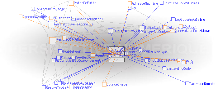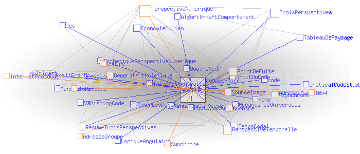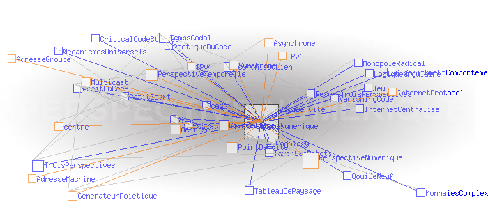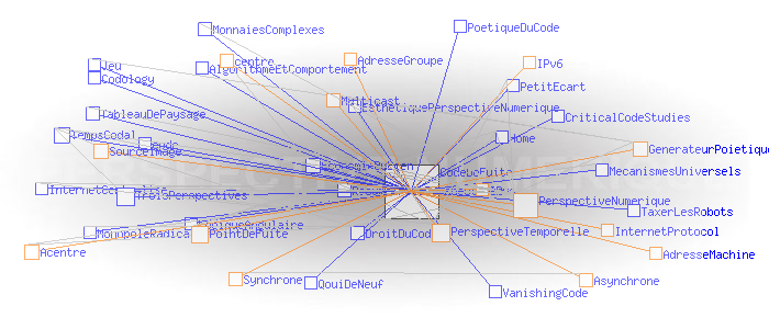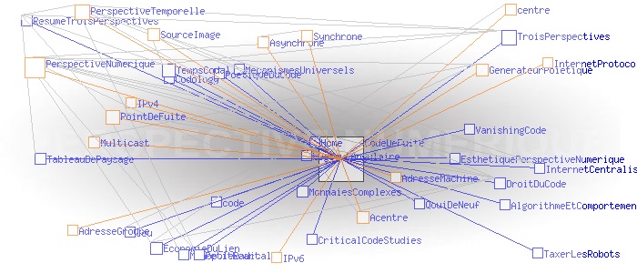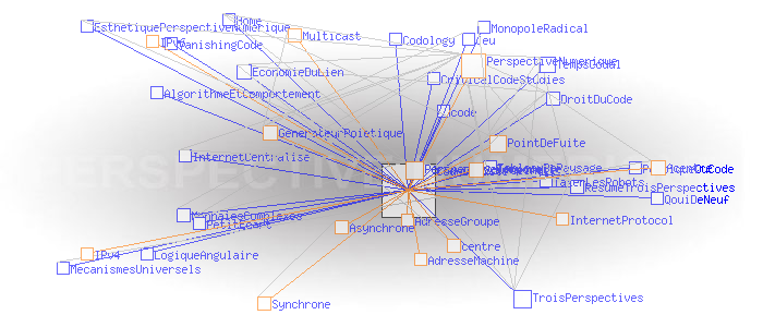 Partie I - Trois perspectivesPerspective numérique et cartographie sémantique #2 Code de fuiteAu coeur de ces innovations, il y a la version 6 de l' Internet Protocol (IPv6) et sa capacité à délivrer une quasi infinité d'adresses, non pas seulement des adresses de machines comme IPv4, mais des adresses de groupes, sous couvert desquelles autant de collectifs plus ou moins étendus peuvent échanger de manière synchrone ou asynchrone sans l'entremise d'aucun centre physique au sens où nous l'avons défini précédemment. C'est le principe de l'IP Multicast. La perspective temporelle actuellement à l'oeuvre (que nous pratiquons comme Monsieur Jourdain...) mutera alors en une " perspective numérique". Pourquoi "numérique"? Parce que le point de fuite de cette troisième perspective, n'est plus un point physique comme dans les deux cas précédents, mais un code - un " code de fuite" -, qui dans le cas du Multicast, est le numéro IP du groupe sous couvert duquel celui-ci peut échanger. Dit autrement, ce code de fuite est simplement le seul point commun entre tous les membres d'un groupe livré à une forme ou une autre d'interaction collective. ![]() Générateur Poïétique: résultat de la première expérience d’ interaction collective synchrone acentrée sur le Multicast Backbone mondial, le 21 novembre 1996 (montage de plans successifs). Source: poietic-generator.net