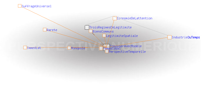 Le régime de légitimité temporel Composer avec le modèleDans la pratique, les choses ne sont évidemment pas si simples: L’ immédiateté pose un problème aux institutions fondées sur le régime de légitimité spatial dont les boucles de rétroaction et de validation sont lentes et fortement ritualisées (le suffrage universel soumis au temps codal). Les biens communs posent un problème à certaines industries du temps, les entreprises de communication, dont le modèle capitaliste vise plutôt à organiser la rareté et à obtenir des positions de monopole. Dans ces deux sphères, les organisations ont donc mis en place des modes de fonctionnement qui composent autant que possible leur réalité propre avec les canons de la perspective temporelle: c’est que l’on peut appeler l’ « économie de l’attention».