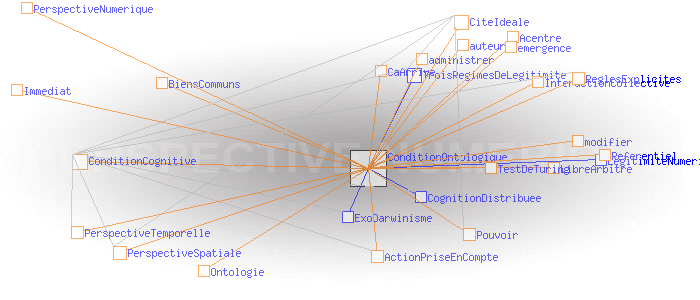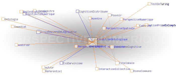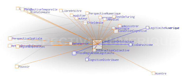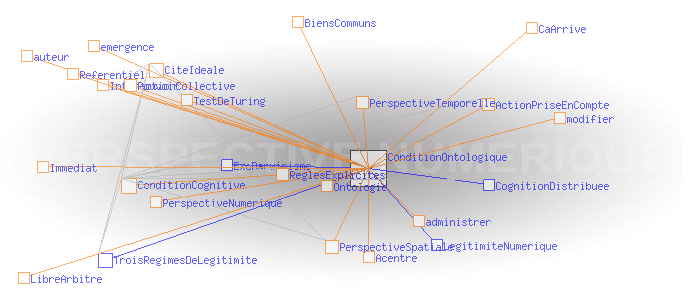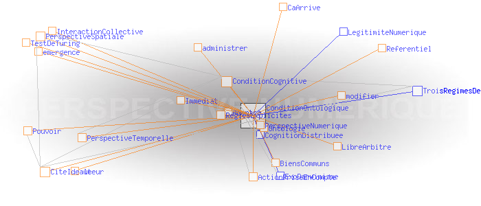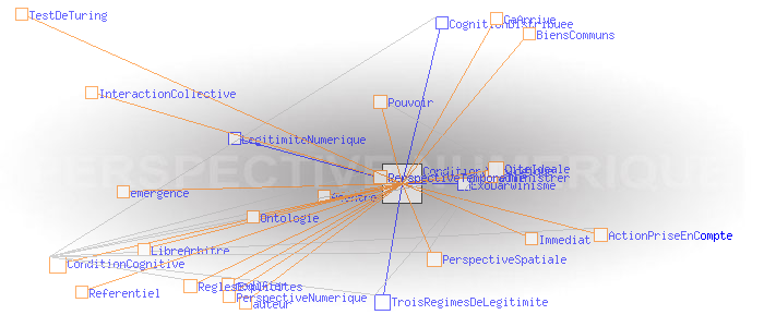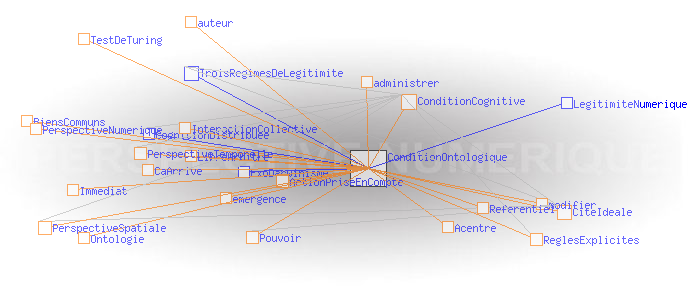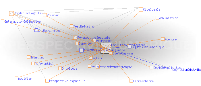 Le régime de légitimité numérique Condition ontologiquePour tenter de d’imaginer le régime de légitimité de la perspective numérique, il faut pousser les logiques des réseaux acentrés dans leurs retranchements afin de construire la cité idéale qui leur ressemble. Comme dans le cas des réseaux centrés, un dispositif acentré peut être considéré comme légitime dans la mesure où il donne le sentiment à chacun des acteurs qu'il pourrait idéalement l’administrer lui-même, voire en modifier éventuellement les règles de fonctionnement. L'utilisateur doit pouvoir vérifier par l'action directe sur le dispositif que son action est prise en compte et traitée immédiatement suivant des règles explicites, comme c’est aussi le cas des actions de tous les autres utilisateurs, y compris celles des auteurs des codes et des interfaces qui lui permettant de fonctionner. Comme dans le cas de la perspective temporelle, chacun doit pouvoir observer directement le résultat de son action personnelle au sein du collectif ( validation cognitive). Mais il faut de plus que le code fasse «lien», c’est à dire qu’il soit reconnu comme signe d’appartenance par le groupe qui l’utilise. Pour cela, d'une part le code doit laisser à chacun son libre arbitre pour savoir s'il le rejoint ou non, puis s'il se retire ou non. D'autre part, tout comme un lieu public n’impose pas les termes des conversations qui s’y déroulent, il ne doit pas présumer, ni de la nature ni de l’issue des interactions qui doivent donc rester le propre du groupe. En dernier ressort, cette reconnaissance du lien passe par une autre, celle du caractère "authentique" des échanges. Il s’agit de reconnaître l’autre et de démasquer tout ce qui n'est pas être lui. Une expérience ontologique en somme, dans laquelle il s’agit d’attendre que " ça arrive" (ou pas), de constater (ou pas) qu’une chose sublime (ou pas) et non préméditée (ou pas) émerge (ou pas) instant après instant à l’intérieur de laquelle chacun reconnaît sa présence (ou pas). En termes scientifiques, cela s'appelle un test de Turing, à l’envers, et à l’échelle collective. Enfin, plus encore que dans le cas de perspective spatiale, le résultat des échanges via un réseau acentré se doit d’être le bien commun des protagonistes. Une fois remplies ces conditions, de l’ interaction collective peut naître le référentiel qui permet à nouveau l’ interaction.