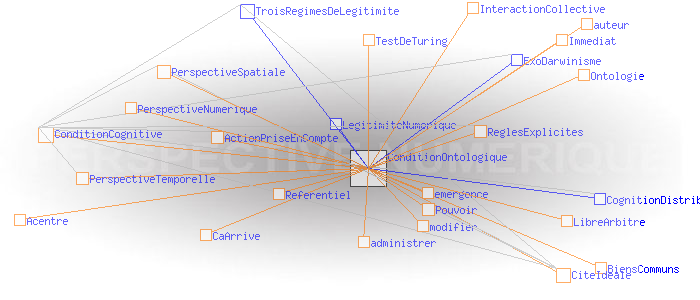 Le régime de légitimité numérique Condition ontologiquePour tenter de d’imaginer le régime de légitimité de la perspective numérique, il faut pousser les logiques des réseaux acentrés dans leurs retranchements afin de construire la cité idéale qui leur ressemble. Comme dans le cas des réseaux centrés, un dispositif acentré peut être considéré comme légitime dans la mesure où il donne le sentiment à chacun des acteurs qu'il pourrait idéalement l’administrer lui-même, voire en modifier éventuellement les règles de fonctionnement. L'utilisateur doit pouvoir vérifier par l'action directe sur le dispositif que son action est prise en compte et traitée immédiatement suivant des règles explicites, comme c’est aussi le cas des actions de tous les autres utilisateurs, y compris celles des auteurs des codes et des interfaces qui lui permettant de fonctionner. Comme dans le cas de la perspective temporelle, chacun doit pouvoir observer directement le résultat de son action personnelle au sein du collectif ( validation cognitive). Mais il faut de plus que le code fasse «lien», c’est à dire qu’il soit reconnu comme signe d’appartenance par le groupe qui l’utilise. Pour cela, d'une part le code doit laisser à chacun son libre arbitre pour savoir s'il le rejoint ou non, puis s'il se retire ou non. D'autre part, tout comme un lieu public n’impose pas les termes des conversations qui s’y déroulent, il ne doit pas présumer, ni de la nature ni de l’issue des interactions qui doivent donc rester le propre du groupe. En dernier ressort, cette reconnaissance du lien passe par une autre, celle du caractère "authentique" des échanges. Il s’agit de reconnaître l’autre et de démasquer tout ce qui n'est pas être lui. Une expérience ontologique en somme, dans laquelle il s’agit d’attendre que " ça arrive" (ou pas), de constater (ou pas) qu’une chose sublime (ou pas) et non préméditée (ou pas) émerge (ou pas) instant après instant à l’intérieur de laquelle chacun reconnaît sa présence (ou pas). En termes scientifiques, cela s'appelle un test de Turing, à l’envers, et à l’échelle collective. Enfin, plus encore que dans le cas de perspective spatiale, le résultat des échanges via un réseau acentré se doit d’être le bien commun des protagonistes. Une fois remplies ces conditions, de l’ interaction collective peut naître le référentiel qui permet à nouveau l’ interaction.