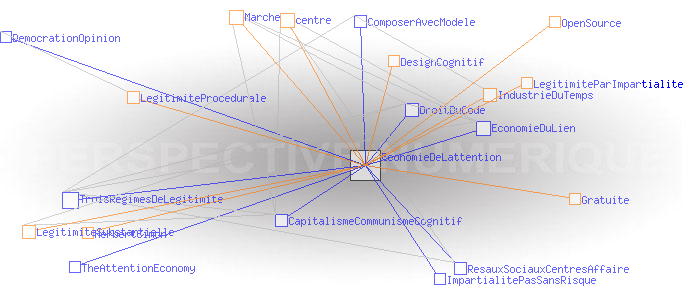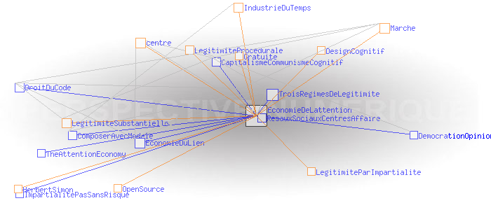 Le régime de légitimité temporel Economie de l’attentionDans la sphère commerciale, ce qui confère à un centre sa capacité d’agréger et de redistribuer l’information, est simplement l’«attention» portée par les utilisateurs au dispositif, c’est à dire le temps qu’ils passent et les gestes qu’ils produisent en interaction avec lui ( Herbert Simon, 1971). Les industries du temps transforment cette matière première en revenus, par exemple, par l’entremise de la publicité. La légitimité de centres de cette économie est donc essentiellement de type procédurale: plus il y a d’attention, plus il y a de ressources (publicitaires entre autres), plus il y a de moyens pour absorber et redistribuer des données et donc pour mobiliser l’attention, ainsi de suite… Les centres de l’ économie de l’attention développent aussi une forme de légitimité par impartialité reposant souvent sur la gratuité des services - qui de fait, traite chacun de manière équivalente -, et sur l’ergonomie et de design cognitif qui assure une certaine lisibilité des processus. La légitimité substantielle provient souvent d’une sorte de mythe fondateur lié à l’innovation, matérialisée par des brevets, des copyrights et des logiciels, bref des codes qui acquièrent d’autant plus de légitimité qu’ils sont livrés finalement à tous en OpenSource. En dernier ressort, la légitimité substantielle provient surtout de la validation de ces innovations par le « marché»; substitut mondain de l’ordre divin.