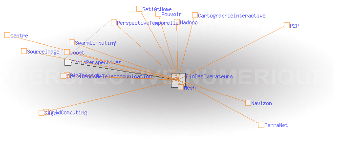 Partie I - Trois perspectivesPerspective numérique et cartographie sémantique #1 Fin des opérateursA peine, nous sommes-nous habitués à la pratique du Web, à la fréquentation de ses serveurs et à la cartographie interactive, qu'une autre invention surgit, qui elle, promet effectivement d’affranchir le réseau de tout ancrage territorial. Ses prémices s'appellent P2P, GridComputing ou SwarmComputing déjà mis en oeuvre dans une première vague de réalisations industrielles ou de recherche telles Seti@home, BitTorrent, Skype, Joost, etc. qui suppriment déjà dans une certaine mesure la notion de centre au sens de la perspective temporelle. Cette première vague en annonce une seconde qui serait en mesure de les supprimer complètement et d’en créer de nouveaux d’une toute autre tournure. Par exemple Hadoop, Navizon ou TerraNet transforment chaque terminal (un simple téléphone mobile par exemple) en un routeur de tous les autres avec lesquels ils sont directement reliés par radio de proche en proche selon le principe des réseaux Mesh. Ces systèmes fonctionnant par voie hertzienne, vont dans l'absolu jusqu'à supprimer les opérateurs de télécommunication dont on sait à quel point leurs infrastructures sont historiquement reliées aux territoires et aux pouvoirs qui les administrent. ![]() Swarm et réseau Mesh : chaque terminal est en même temps le routeur de tous les autres Source: BitOnWheels