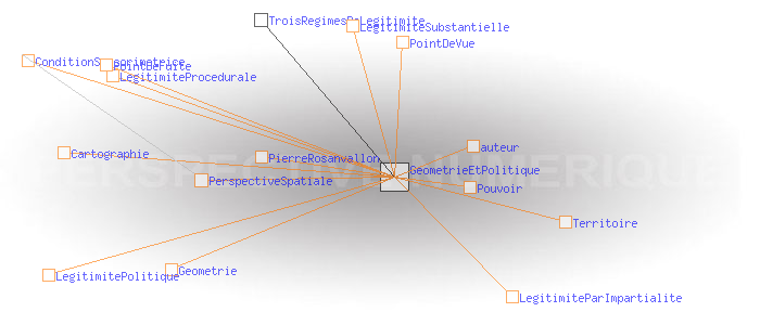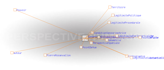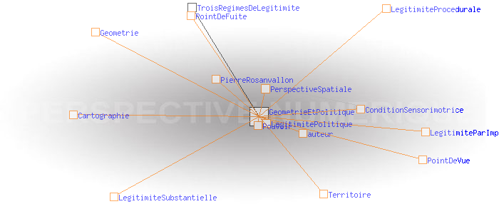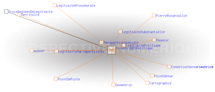 Le régime de légitimité spatial Géométrie et politiqueUn tableau peut être considéré comme répondant aux canons de la perspective spatiale dans la mesure où il donne le sentiment à ses spectateurs qu'ils peuvent idéalement emprunter le point de vue du peintre. En d’autres termes, l'observateur doit pouvoir vérifier d'un seul coup d'oeil que la taille des personnages et les objets est fonction de leur éloignement du point de vue, et qu'un point de fuite homologue de l'oeil de l’auteur organise les fuyantes de manière cohérente. En matière de cartographie, c'est la conformité géométrique de la carte au territoire qui doit pouvoir être vérifiée par l'expérience du terrain. La condition pour que la carte devienne le support des projections et des actions collectives est donc d’ordre sensorimotrice. Pour effectuer la traduction en terme de légitimité politique, il faut remplacer le «peintre» par le «Prince». A savoir que ce dernier doit donner le sentiment à ses sujets que chacun d'eux, se substituant idéalement à lui, effectuerait les mêmes constats, hiérarchiserait les sujets de la même manière, et prendrait les mêmes décisions. Chacun doit aussi pouvoir vérifier qu'il est traité de façon cohérente avec son point de vue et que personne n'échappe à ce traitement, y compris le Prince lui-même. Ces conditions de légitimité quasi géométriques peuvent s’exprimer en termes plus politiques en utilisant la typologie proposée par Pierre Rosanvallon. Selon lui, il existerait trois types de légitimité: