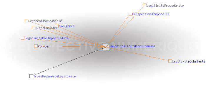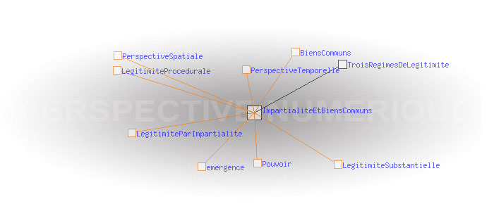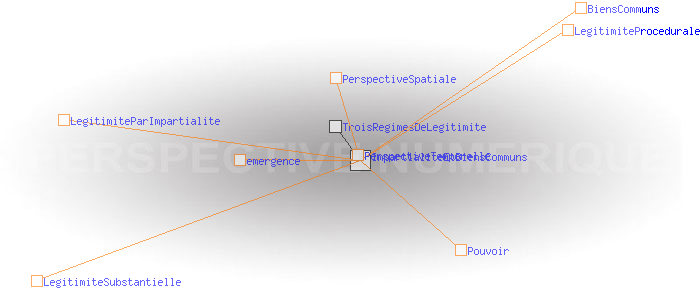 Le régime de légitimité temporel Biens CommunsDans la perspective spatiale, l'observateur n'est pas forcément confondu avec la chose représentée. Dans la perspective temporelle au contraire, les données émergeant de l’interaction sont le fruit des acteurs eux-mêmes. Celles-ci doivent en conséquence constituer une sorte de bien commun que rien ni personne ne peut s’approprier. Chacun est aussi en mesure de vérifier que ces biens communs le sont vraiment, par exemple en tentant d’en obtenir une copie intégrale. Traduit en termes politiques, la légitimité procédurale du pouvoir repose sur sa capacité à traiter les actions de chacun dans l’instant même, y compris les requêtes relatives à son processus d’accession ou de maintien au pourvoir. La légitimité par impartialité repose sur l’universalité et la lisibilité des règles de traitement que le pouvoir met en œuvre. Et c’est en étant le garant des biens communs issus de l’interaction de tous via son dispositif qu’il accède à la légitimité substantielle.
