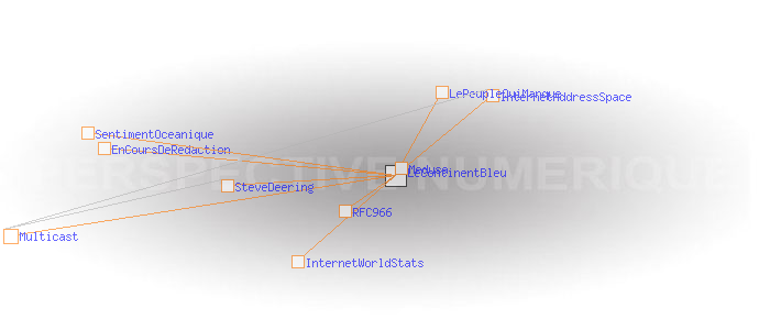 Le continent bleuEnCoursDeRedaction Il est de plus en plus évident que l'Internet mondial doit maintenant procéder à une rénovation majeure pour arriver à suivre l'explosion des besoins et des usages de ses utilisateurs dont le nombre a maintenant dépassé le milliard. Les principes techniques de l'Internet tels que nous le connaissons datent en effet de 1983. 'est l"Internet Protocol" IP version 4 (IPv4). Le passage à la nouvelle technologie "IPv6" est préparée de longue date par l'IPv6 Task Force ![]() Gauche=Carte globale de l'Internet Address Space | Centre zoom#1 | Droite = zoom#2 | Rouge=ne répond pas | Vert=actif | Bleu=privé ou non affecté ![]() IPv4AddressReport http://www.potaroo.net/tools/ipv4/index.html Notes: IPv6 Task Force http://www.g6.asso.fr/tff/index.php/Main_Page IPv4AddressReport http://www.potaroo.net/tools/ipv4/index.html InternetAddressSpace http://www.isi.edu/ant/adress/index.html Medusa Multicast RFC 966 - Host groups: A multicast extension to the Internet Protocol S. E. Deering, D. R. Cheriton, Stanford University, December 1985 http://www.faqs.org/rfcs/rfc966.html SentimentOceanique? LePeupleQuiManque?