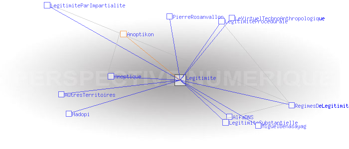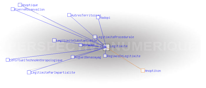 A) Tout agent A a-t-il le droit réel d’accéder au réseau s’il en fait la demande? A peut-il quitter le réseau librement ? AB) Tout agent B (présent ou futur, y compris les agents qui conçoivent, gèrent et développent le réseau) est-il traité comme A ? ABC) Si trois agents A, B et C (trois étant le début d’une multitude) appartiennent à un réseau qui répond aux deux premiers critères, constituent ils des pairs? Autrement dit, sont-ils en mesure de se reconnaître, de se faire confiance, de se respecter les uns les autres, de construire des représentations communes et du sens commun ? Voir Pages ayant un lien vers la page courante : AlfaDNS Anoptique AutresTerritoires Hadopi LegitimiteParImpartialite LegitimiteProcedurale LegitimiteSubstantielle LeVirtuelTechnoAnthropologique MiguelBenasayag PierreRosanvallon RegimesDeLegitimite