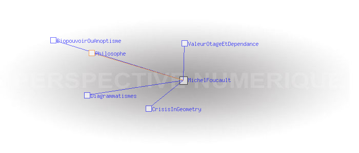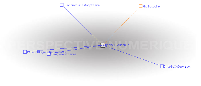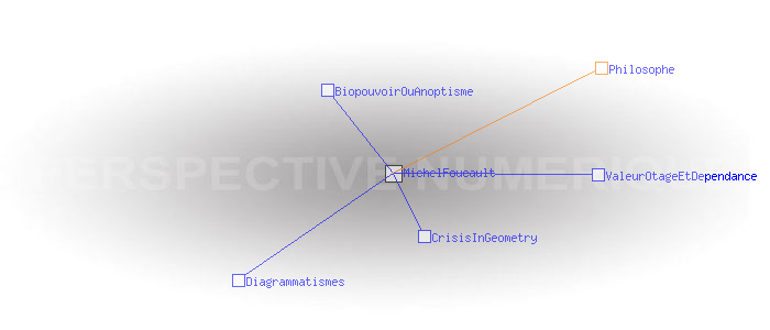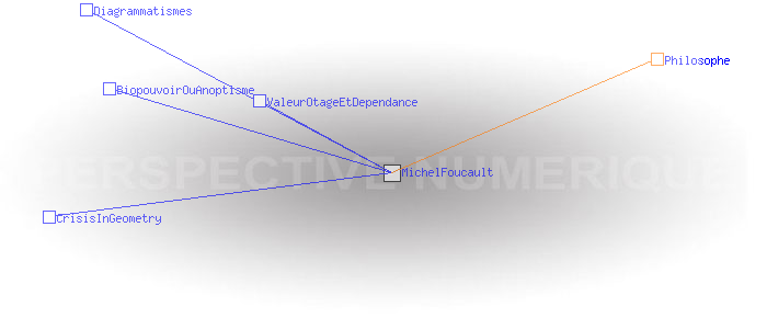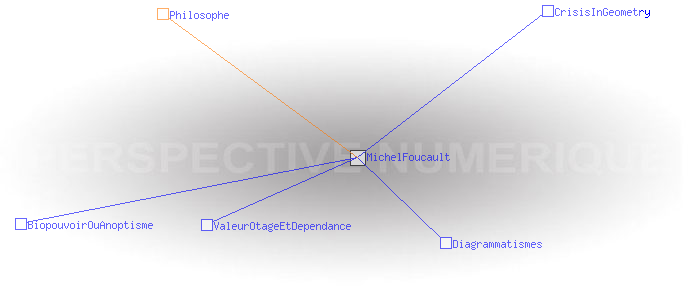 Michel FoucaultPaul Michel Foucault, né le 15 octobre 1926 à Poitiers et mort le 26 juin 1984 à Paris, est un philosophe français. Il fut, entre 1970 et 1984 titulaire d'une chaire au Collège de France à laquelle il donna le titre d'Histoire des Systèmes de Pensée. http://fr.wikipedia.org/wiki/Michel_Foucault Philosophe Pages ayant un lien vers la page courante : BiopouvoirOuAnoptisme CrisisInGeometry Diagrammatismes ValeurOtageEtDependance