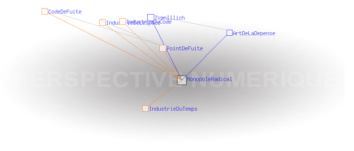 Monopole radicalLe monopole radical est une notion descriptive et critique de la société moderne de consommation et de productivisme. Développée par Ivan Illich, elle désigne non pas la situation monopolistique d'une marque particulière mais le monopole induit d'une ou plusieurs marques visant à modifier, contrôler et à terme contraindre des populations à modifier radicalement (d'où l'épithète « radical ») leurs habitudes quotidiennes notamment en restreignant leurs choix et leurs libertés. Le monopole radical touche à tous les domaines de la vie quotidienne mais essentiellement ceux qui impliquent nécessairement un acte participatif d'achat et de consommation. Il impose ainsi de nouvelles habitudes alimentaires, vestimentaires, des contraintes dans la manière de se déplacer (marche à pied et vélo vaincus par les véhicules motorisés), d'aller au spectacle (toute puissance de la télévision),... http://fr.wikipedia.org/wiki/Monopole_radical IvanIllich PointDeFuite CodeDeFuite IndustrieDeLespace IndustrieDuTemps IndustrieDuCode