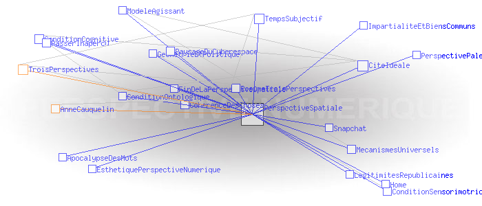 Perspective spatialeVoici quelques 600 ans [..] avec l’invention de la perspective, le tableau de paysage devient la norme de la perception de ce qui nous entoure. [...] Elle ne semble plus convenir à la perception d’un monde que les nouvelles technologies de la communication ont bouleversé. Anne Cauquelin Voir "Trois perspectives" Pages ayant un lien vers la page courante : ApocalypseDesMots CiteIdeale CoherenceDesChoses ConditionCognitive ConditionOntologique ConditionSensorimotrice EsthetiquePerspectiveNumerique FinDeLaPerspectiveSpatiale GeometrieEtPolitique ImpartialiteEtBiensCommuns LegitimitesRepublicaines MecanismesUniversels ModeleAgissant PasserInapercu PaysageDuCyberespace PerspectivePaleolithique ResumeTroisPerspectives Snapchat TempsSubjectif