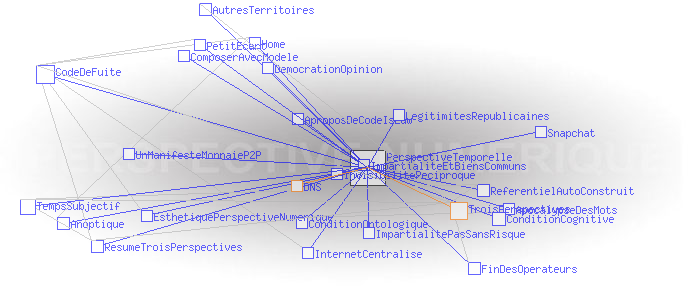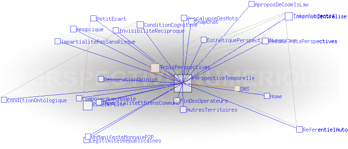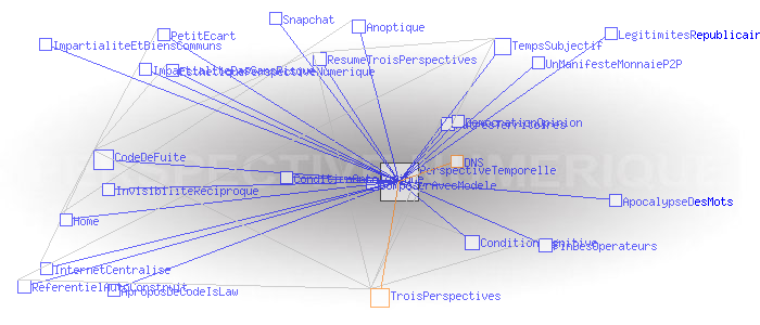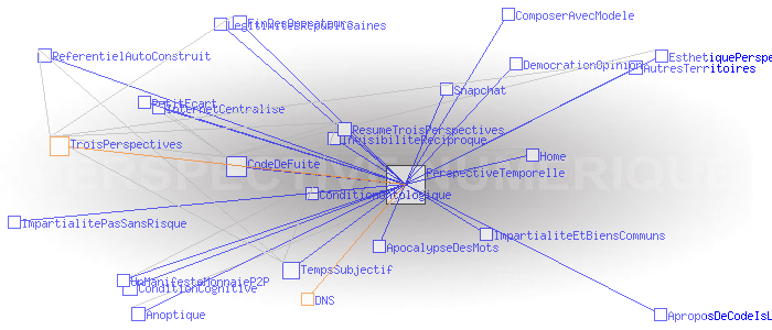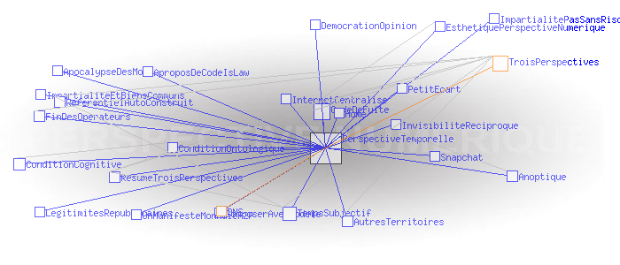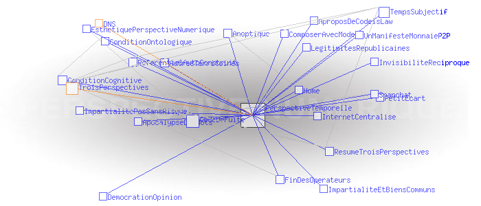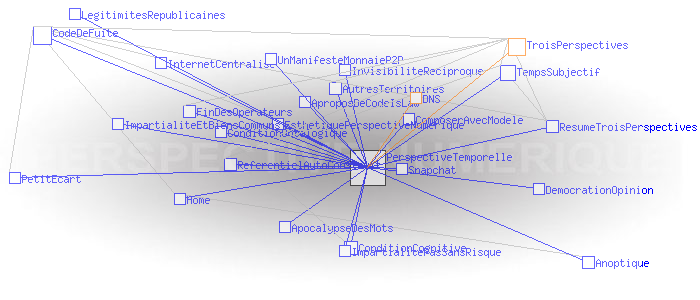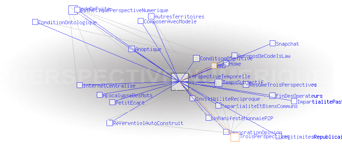 perspective temporelleLa perspective temporelle est née pendant la Révolution française avec l'invention du télégraphe. Elle domine aujourd'hui. Ses points de fuite sont les moteurs de recherche, les sites web et le système de DNS que nous connaissons. Voir "Trois perspectives" Pages ayant un lien vers la page courante : Anoptique ApocalypseDesMots AproposDeCodeIsLaw AutresTerritoires CodeDeFuite ComposerAvecModele ConditionCognitive ConditionOntologique DemocrationOpinion EsthetiquePerspectiveNumerique FinDesOperateurs ImpartialiteEtBiensCommuns ImpartialitePasSansRisque InternetCentralise InvisibiliteReciproque LegitimitesRepublicaines PetitEcart ReferentielAutoConstruit ResumeTroisPerspectives Snapchat TempsSubjectif UnManifesteMonnaieP2P