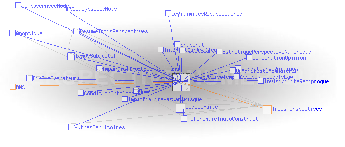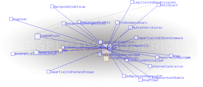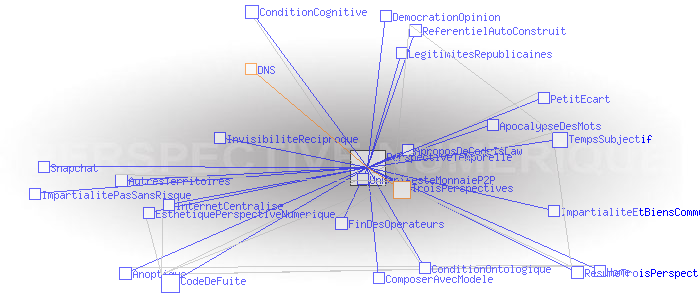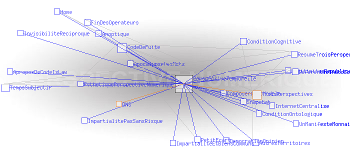 perspective temporelleLa perspective temporelle est née pendant la Révolution française avec l'invention du télégraphe. Elle domine aujourd'hui. Ses points de fuite sont les moteurs de recherche, les sites web et le système de DNS que nous connaissons. Voir "Trois perspectives" Pages ayant un lien vers la page courante : Anoptique ApocalypseDesMots AproposDeCodeIsLaw AutresTerritoires CodeDeFuite ComposerAvecModele ConditionCognitive ConditionOntologique DemocrationOpinion EsthetiquePerspectiveNumerique FinDesOperateurs ImpartialiteEtBiensCommuns ImpartialitePasSansRisque InternetCentralise InvisibiliteReciproque LegitimitesRepublicaines PetitEcart ReferentielAutoConstruit ResumeTroisPerspectives Snapchat TempsSubjectif UnManifesteMonnaieP2P