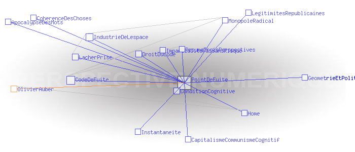 Dans ce nouveau paradigme de la perspective, le point de fuite n'est plus cantonné dans un ordinateur particulier mais devient une collection de noeuds interconnectés formant une sorte de lieu communs grace à un code partagé par tous les sujets individuels. Comme son ancêtre spatial, ce point de fuite répond à un objet ou à un projet abstrait qui met en mouvement l'interaction collective. De même,il est l'homologue d'un auteur, individuel ou collectif, ayant conçu et mis en place le dispositif de représentation, et enfin chacun peut vérifier les règles de construction employées, car la rigueur logique de l'assemblage des codes rendant possible la perspective numérique saute aux yeux aussi bien que la rectitude des fuyantes spatiales. Une fois que le point de fuite et les règles de représentation sont fixés et reconnus par l'ensemble des sujets, aucun d'entre eux, ni qui que ce soit d'autre, pas même le ou les auteurs du dispositif, n'est en mesure de contrôler la narration qui en émerge. Elle est à la fois univoque et indéterminée. Seconde après seconde, les actions sont produites relativement à cette inconnaissance et ne font que la renforcer. L'entrelacs de pensées et d'actes qui la conduisent est infini et invisible, comme cette sorte de surface sans bord qu'est le réseau. Pourtant, de l'unité du point de fuite se dégage une pluralité de sens que structure l'interprétation de chacun. Le point de fuite est bien le lieu du "Arrive t'il?"(7), du futur entièrement en puissance, et chacun y côtoie l'autre pour contempler le spectacle sublime du rhizome(4).