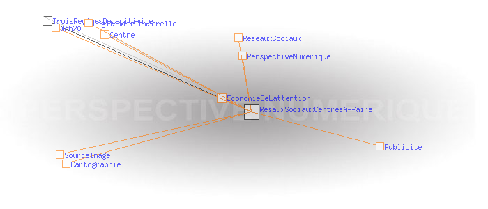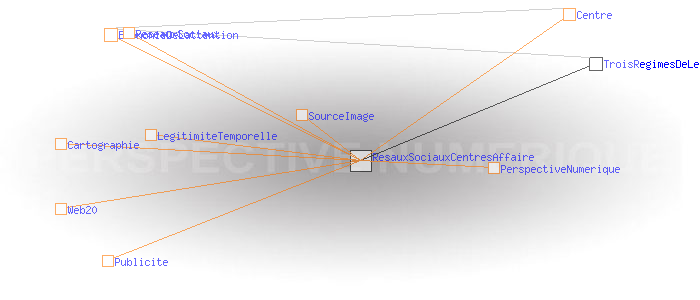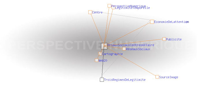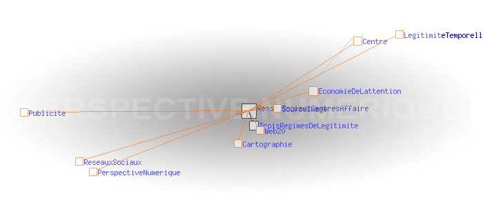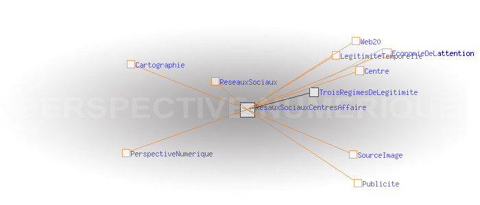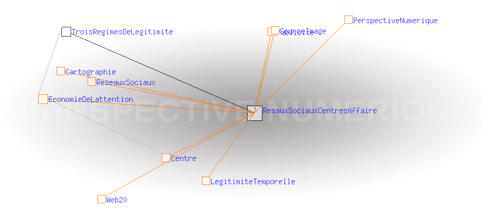 Le régime de légitimité temporel Reseaux sociaux ou Centres d'affaire?Les nouvelles plateformes du Web, dit « 2.0» qui selon une étude attirent déjà l’attention de 60% des internautes français, proposent encore d’autres variantes de légitimité sur le registre temporel, mais elles vont un cran plus loin. Leur matière première n’est plus seulement l’ attention des usagers, mais la cartographie de leurs « réseaux sociaux», ce qui leur permet, entre autres, de cibler au mieux la publicité. En cela, le Web 2.0, bien reposant encore sur une version centrée de l'Internet, met un pied dans un autre régime de légitimité, celui de la perspective numérique fondé sur le «code» au sens de signe de reconnaissance. ![]() Visualisation d’un réseau social sur Facebook Source : TouchGraph
