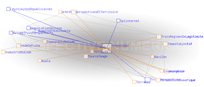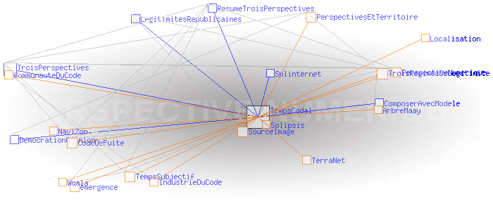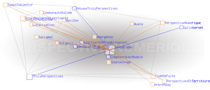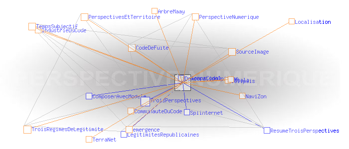 Partie I - Trois perspectivesPerspective numérique et cartographie sémantique #4 ![]() Datapainting / Infoscape / Parcours#1 (identités). Source : Yann Le Guennec Temps codalDès aujourd’hui, des prototypes de moteurs de recherche et d’environnements virtuels distribués (Wuala, TerraNet, NaviZon, Solipsis, @rbre+jMaay, etc.) annoncent des nouveaux modèles concurrents de leurs équivalents centralisés (Google, SecondLife, Facebook, etc). La perspective numérique annonce donc à son tour une perte d'influence des centres de la perspective temporelle aujourd’hui dominants au profit de nouveaux. La nature de ces nouveaux centres est tout à fait paradoxale. En principe, ce sont des codes, c’est à dire des entités qui n’ont pas de rapport avec le temps et l’espace. Or ces codes, de nature arbitraire, sont nécessairement attribués ou déterminés suivant des procédures qui résultent de choix et qui prennent logiquement la forme de programmes et de logiciels. Ces logiciels sont écrits par des humains qui eux, sont situés quelque part. Et ces programmes peuvent aussi changer suivant les choix que font les humains en question. Bref, le " code de fuite" a toujours partie liée avec le temps et l’espace. Le temps subjectif émergeant de l’interaction serait ainsi tributaire d’un temps agissant en amont, que l’on pourrait appeler un " temps codal", c’est à dire qui serait la conséquence des changements de modalités du code (ex: le passage d'une version à une autre d'un programme). Le lieu du code de fuite serait lui, distribué, ou discrétisé, suivant la localisation de tous ceux qui, à un degré ou à un autre, conditionnent ses changements: " industries du code" ou " communautés du code". ![]() Linux timeline: carte des distribution de Linux et de leur mises à jour. Source : Distro Fin de la partie I Parties II - Trois régimes de légitimité Parties II - Perspective et territoire