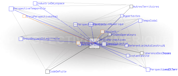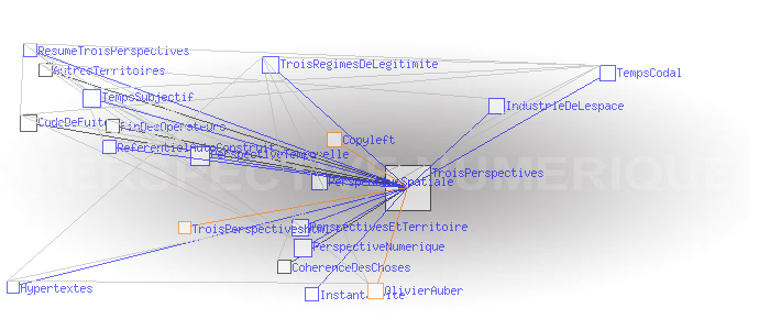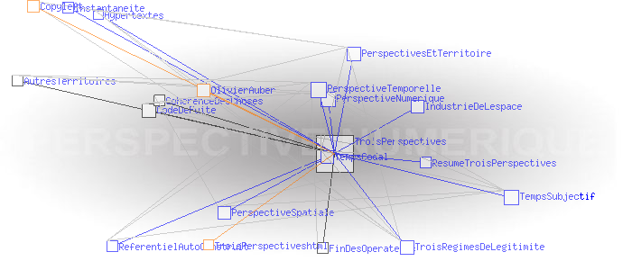 Partie I - TROIS PERSPECTIVES<Imprimer cette partie>Résumé I.1. Perspective spatiale et cartographie physique I.2. Perspective temporelle et cartographie interactive I.2. Perspective numérique et cartographie sémantique Suite... Parties II - Trois régimes de légitimité Parties III - Perspective et territoire Copyright © 2007 Olivier Auber Copyleft